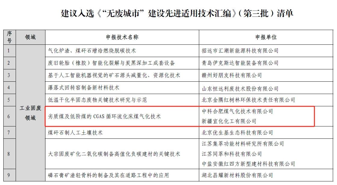 中合氣化:CGAS循環流化床煤氣化技術入選《“無廢城市”建設先進適用技術》