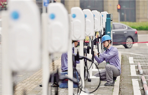 海寧加快建設(shè)充電樁,助推綠色出行。圖為工作人員檢查充電樁。  王軼辰攝